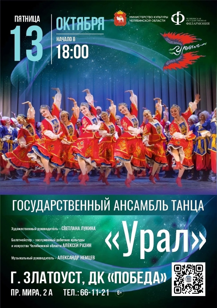 Вас ждет восхитительный и захватывающий мир танца! Всего один день 13 октября созвездие профессиональных танцоров "Урала" будет в Златоусте! Не пропустите! Приходите! Получите заряд ярких эмоций!