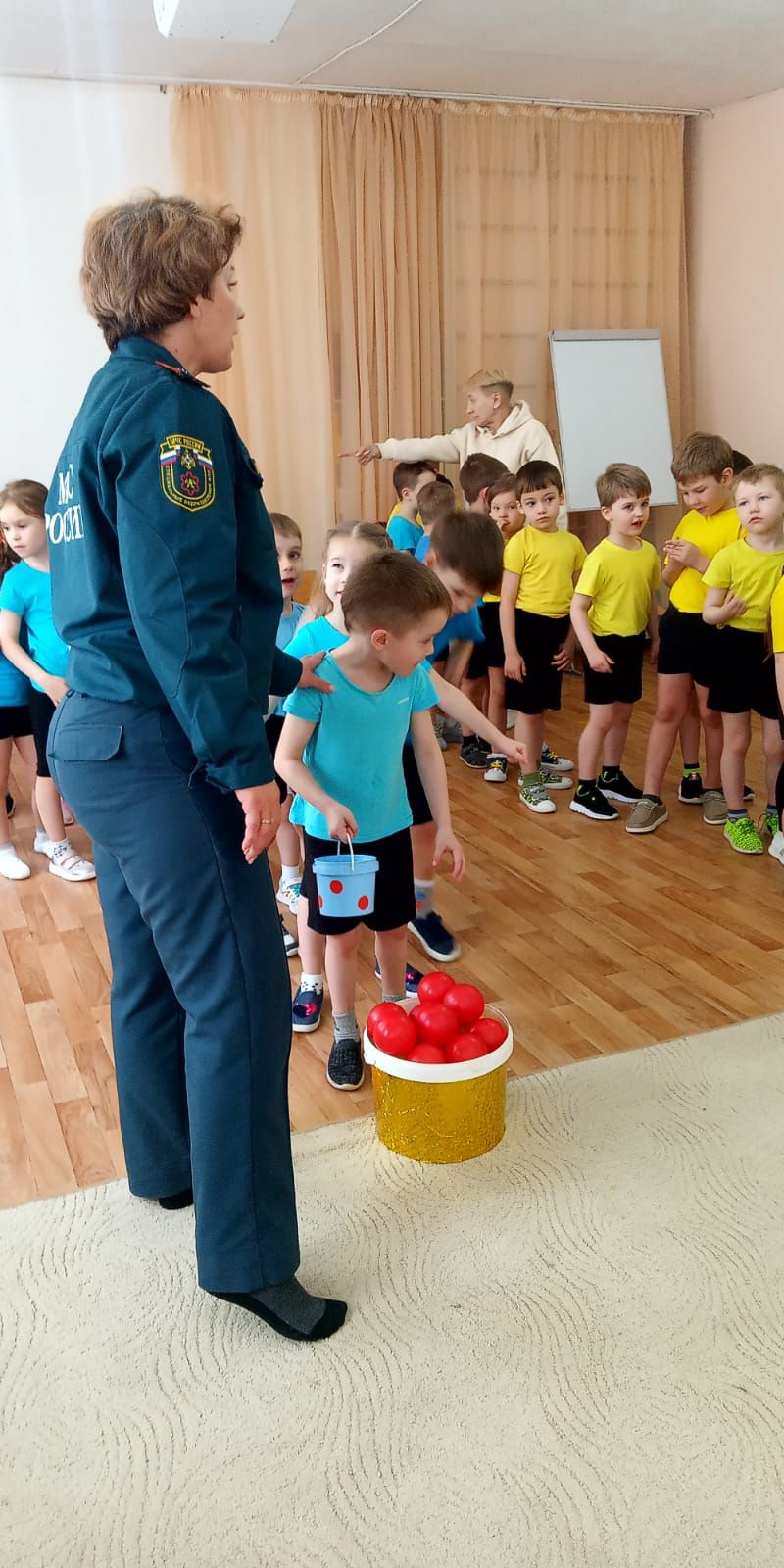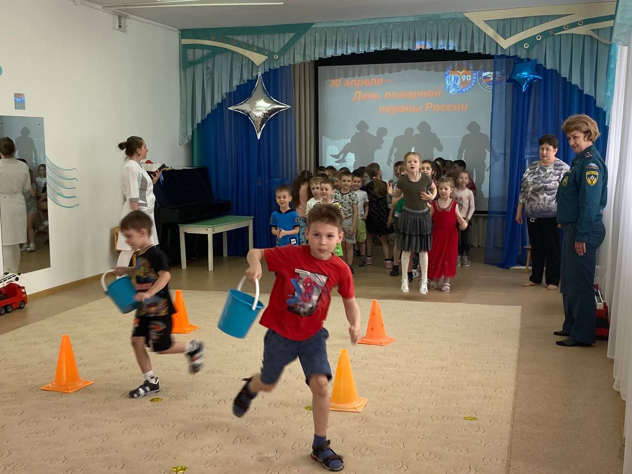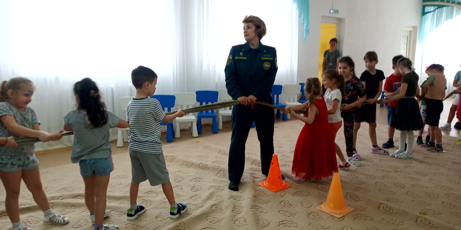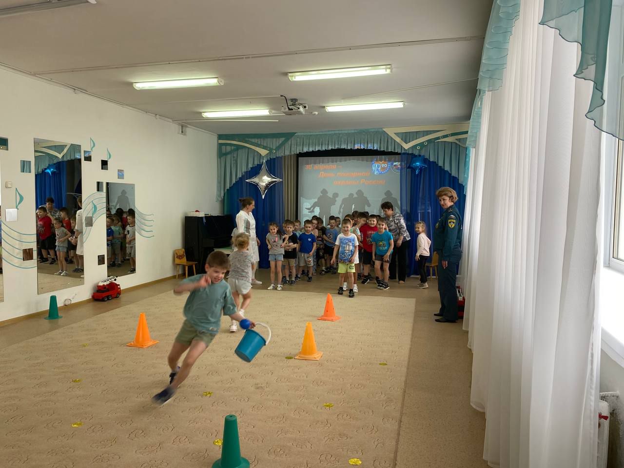Во время проведения пожарной эстафеты юные огнеборцы надевали на время боевую одежду пожарного и газо-дымозащитный комплект, на игрушечном автомобиле доезжали до места вызова, преодолевая препятствия, спасали игрушки из «огня», проводили «тушение пожара». А в конце эстафеты дошкольники соревновались в перетягивании пожарного рукава.